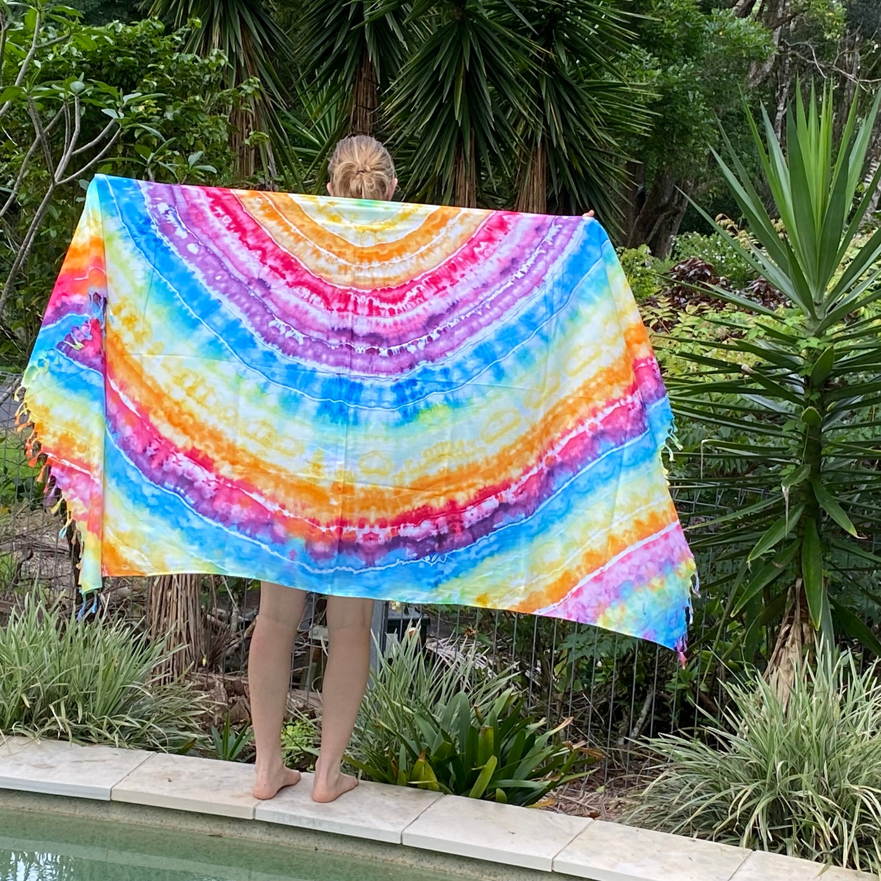 Wrap yourself in this colourful tie dyed Sarong, it's gorgeously soft and flowing with the sweetest of fringe.